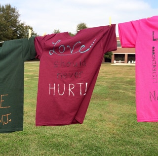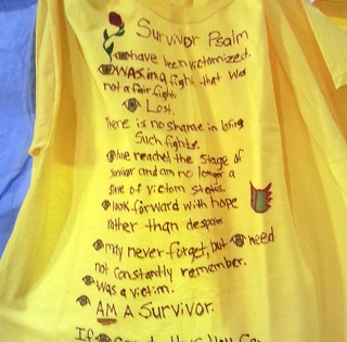 “The Clothesline Project has been displayed at Utah Valley University each year since 1998. For the past 5 years, about 30-50 shirts are added to our collection annually. We estimate that we have over 2,000 shirts in total.”