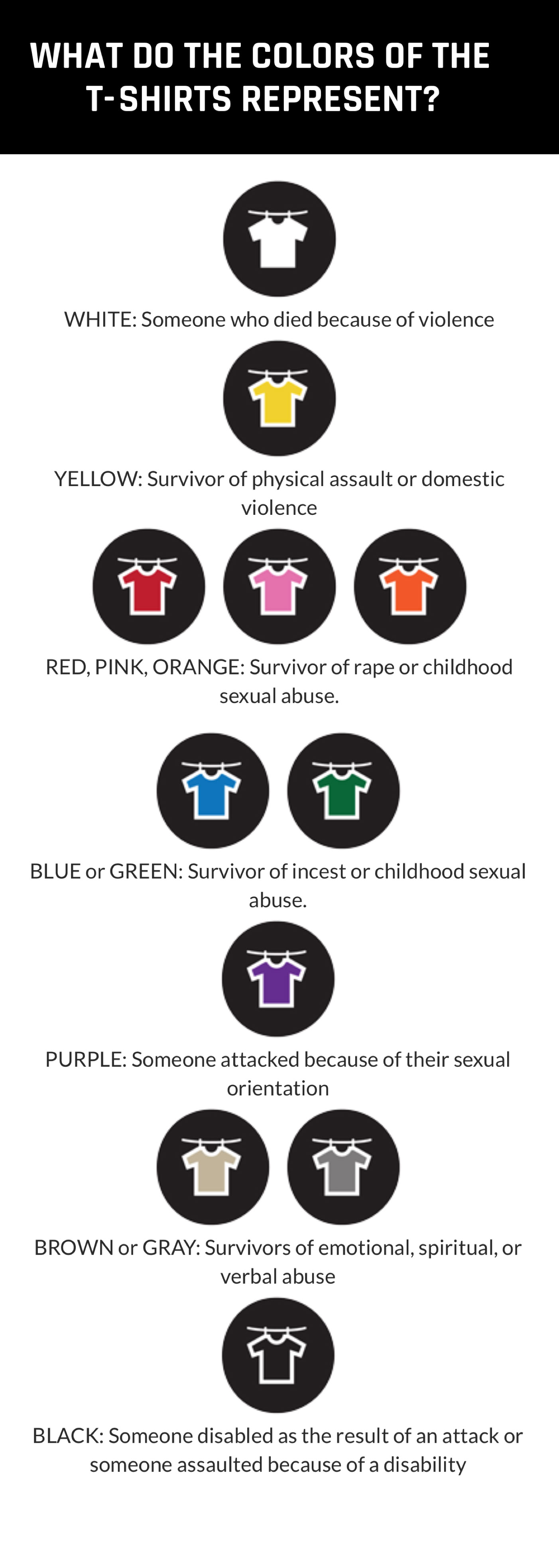 2. Only shirts to be submitted, please (no pants, underwear, etc.). Originally there was a color code that gave us a visual "statistic" regarding the types of violence to which women were exposed. That color code was established as follows: